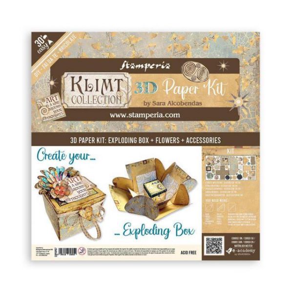 3D set papira Stamperia, Klimt omogućuje vam izradu prekrasnih 3D projekata inspiriranih umjetnošću Gustava Klimta. Set uključuje sve potrebne elemente za kreiranje unikatnih kutija, cvjetova i dodataka.
