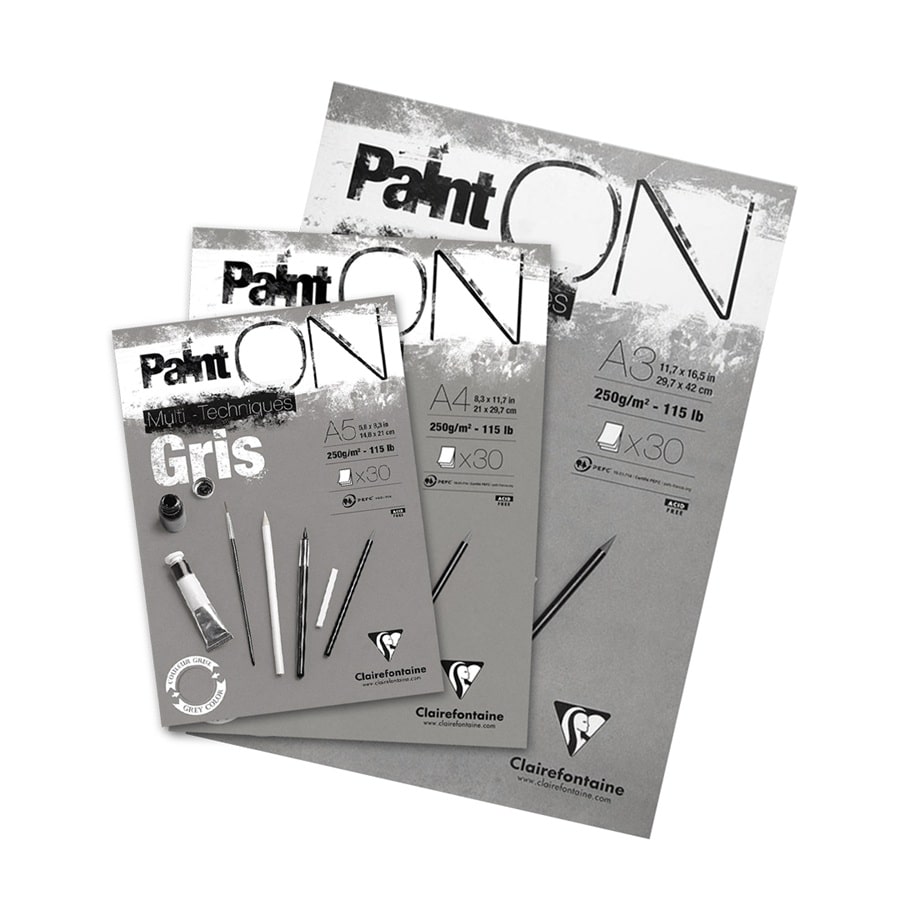 Blok za crtanje Paint ON Multi-Technique Gris 250 g., 30 listova, idealan za olovku, tuš, pastel, akril i markere. Dostupan u formatima: A3 (29,7 × 42 cm), A4 (21 × 29,7 cm) i A5 (14,8 × 21 cm). Pakiranje: 1 komad