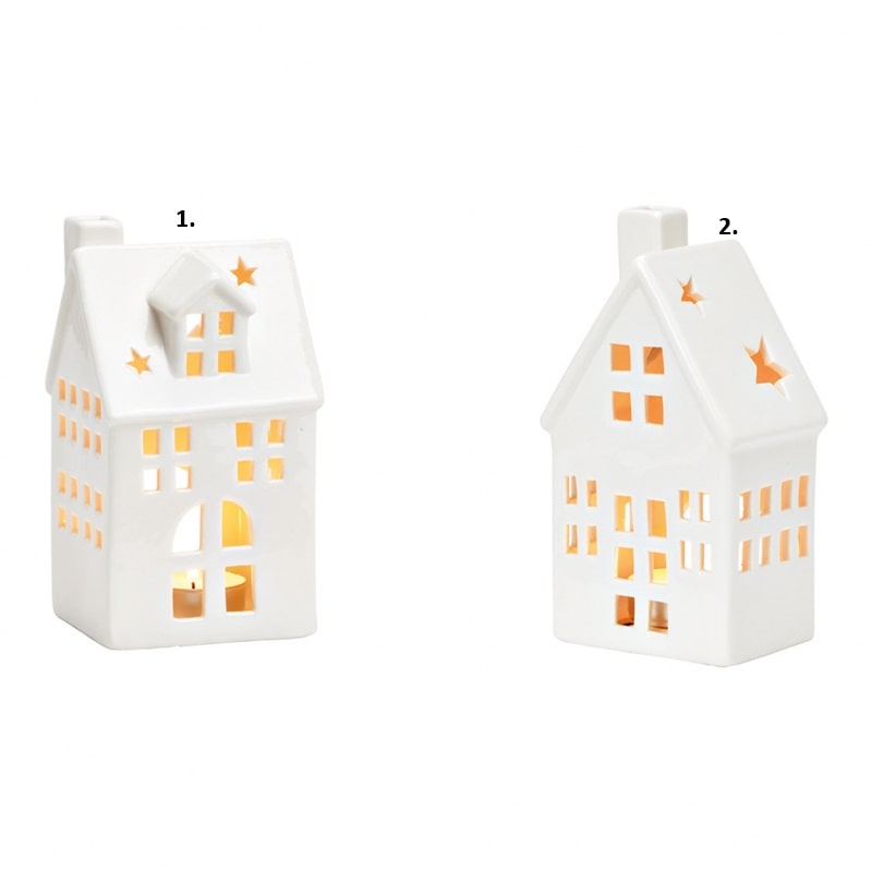 Porculanska kućica 7×4.5×3.5 cm, idealna za bor ili božićno selo, dostupna u dva modela. Pakiranje: 1 komad.