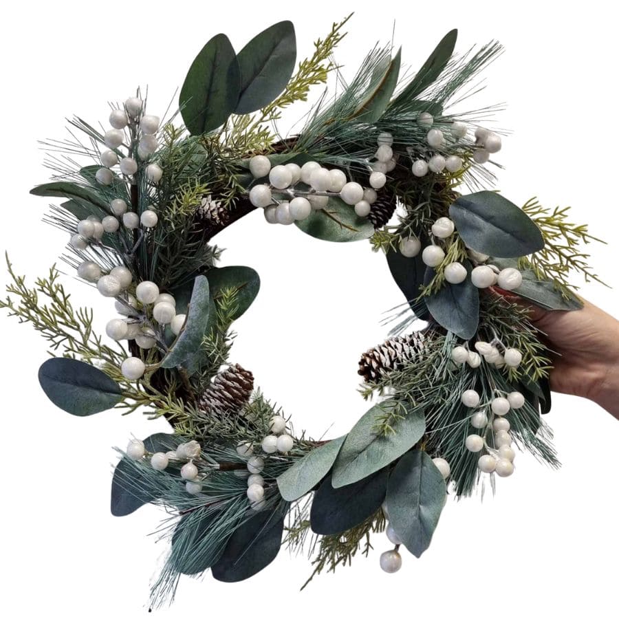 Božićni vjenčić s bijelim bobicama 48 cm, savršen za vrata, zid ili blagdanske aranžmane.