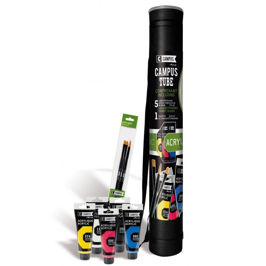 Campus akrilne boje 5/1 + 3 kista set sadrži pet tubica od po 100 ml intenzivno pigmentiranih boja i tri kista. Boje su pogodne za različite površine kao što su papir, platno i drvo. Pružaju dugotrajni satenski sjaj nakon sušenja.