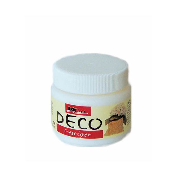 Deco učvršćivač proizvođača Hobby Line omogućuje oblikovanje prirodnih materijala kao što su svila, tekstil, koža i natur papir, pa čak i jeans. Deco učvršćivačem možete od svilenog šala izraditi novi širm za svjetiljku, ukrasiti čašu ili bocu, od pamučne vrećice možete izraditi ukrasnu vazu za suho cvijeće, od jeans hlačica stalak za sitni pribor, igračke i sl. Deco Festiger nanosi se kistom na materijal (tako da prekrije cijelu površinu), a zatim, dok je još mokar, materijal oblikovati po želji (zgužvati, savijati) i ostaviti da se suši. Materijal se može obojati prije nanošenja Deco Festiger-a ili nakon sušenja kad je ukrasni predmet već oblikovan npr. akrilnim bojama. Također se može i lakirati za zaštitu od vlage hobby sjajnim ili bezbojnim mat lakom. Suši se 2-3 dana na sobnoj temperaturi ili desetak minuta u pećnici na 110°C ili sušilom za kosu dok predmet ne postane suh i krut. Ako se suši u pećnici, moguće je naknadno korigiranje forme nakon vađenja iz pećnice, jer je materijal još fleksibilan.