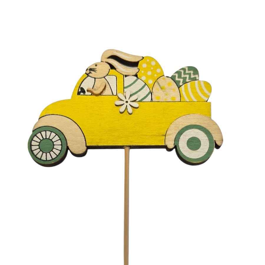 Dekorativni drveni zeko u autu na štapiću 9×5.5 cm