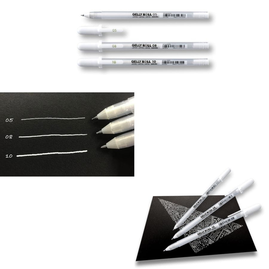 Gelly roll bijeli – gel olovka za pisanje i crtanje na crnim i tamnim papirima. Intenzivna bijela tinta, glatko pisanje i ujednačen protok bez razmazivanja. Dostupna u više veličina vrha – svaka se prodaje zasebno.