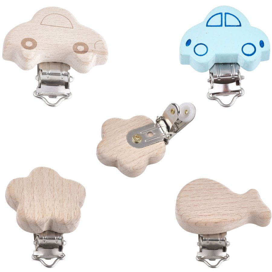 Kopča za dudu drvena s metalnim mehanizmom, dostupna u više oblika – idealna za izradu personaliziranih baby dodataka. Pakiranje: 1 komad.