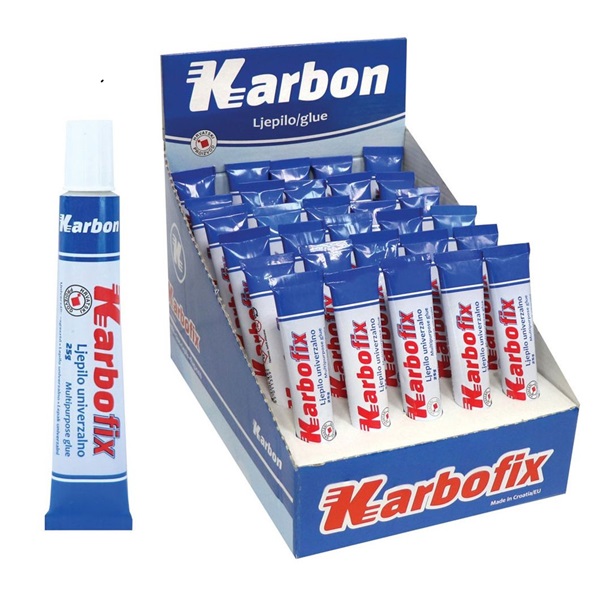 Ljepilo univerzalno u tubi 25 g Karbofix idealno za lijepljenje različitih materijala poput plastike, metala, stakla, keramike, tkanina i drva.