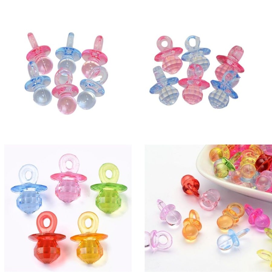 Dekorativne plastične perlice u obliku dudica savršen su dodatak za izradu suvenira, pozivnica, ukrasa za baby showere, rođendane ili DIY projekte. Dostupne u raznim bojama i veličinama, ove dudice dodaju dašak razigranosti i šarma svakom dekoru. Izrađene su od kvalitetne prozirne plastike, s precizno oblikovanom rupom za jednostavno nizanje ili pričvršćivanje.