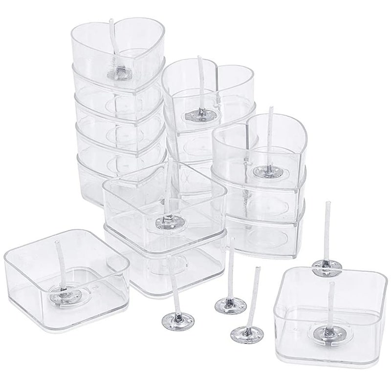 Posudice za svijeće plastične set 40 komada, u oblicima srca i kvadrata, uz 100 parafinskih fitilja za svijeće. Idealno za DIY izradu svijeća. Pakiranje: 1 set.