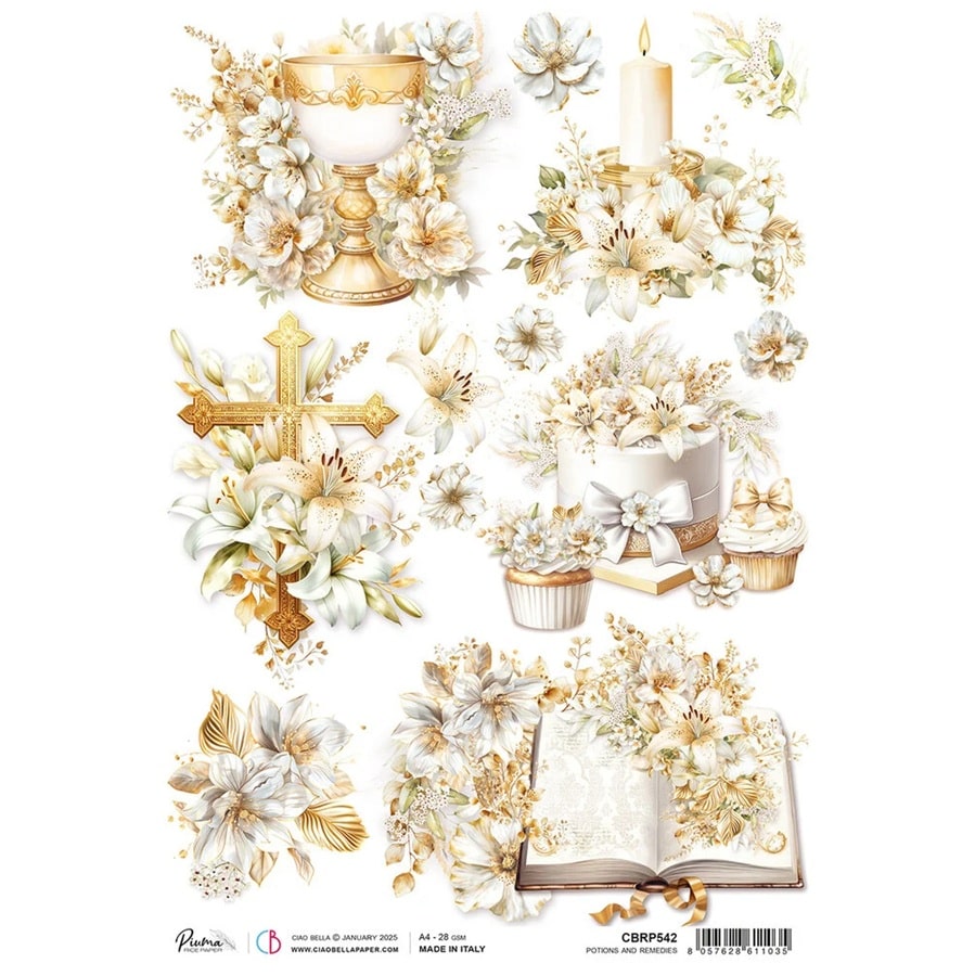Ovaj A4 rižin papir iz kolekcije Blessing Day s dizajnom Potions and Remedies idealan je za projekte inspirirane svetim sakramentima poput krštenja, prve pričesti i krizme. Prikazuje elegantne simbole poput kaleža, križa, svijeće, otvorene knjige i cvjetnih aranžmana – u profinjenoj bijelo-zlatnoj kombinaciji. Tiskan je na teksturiranom rižinom papiru linije Piuma, koji je poznat po svojoj mekoći, visokoj kvaliteti i iznimnoj detaljnosti ispisa. Idealan je za dekupaž, mješovitu umjetnost i rukotvorine.