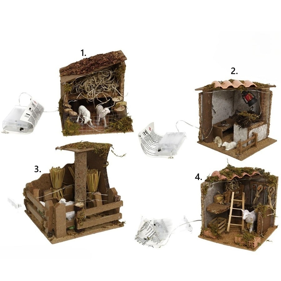 Scena štalice za selo s LED lampicama na baterije (baterije nisu uključene) u 4 različite varijante, idealan dodatak jaslicama i božićnom selu. Veličina: 14×14 cm. Pakiranje: 1 komad