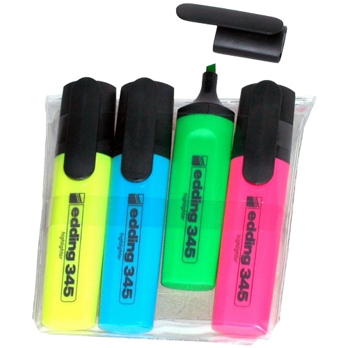 Set signir markera Edding 345 dolazi u četiri jarke boje: žuta, plava, zelena i roza. Kliničasti vrh omogućava širinu iscrtavanja od 2 do 5 mm, idealno za isticanje važnih informacija.