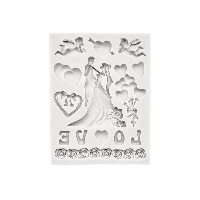 Silikonski kalup s romantičnim motivima vjenčanja savršen je za izradu dekoracija za torte, kolače i druge slastice. Kalup sadrži motive mladenaca, srca, anđela, ruža i natpisa LOVE, što ga čini idealnim za ukrašavanje svadbenih torti, kolačića i slatkih dekoracija.