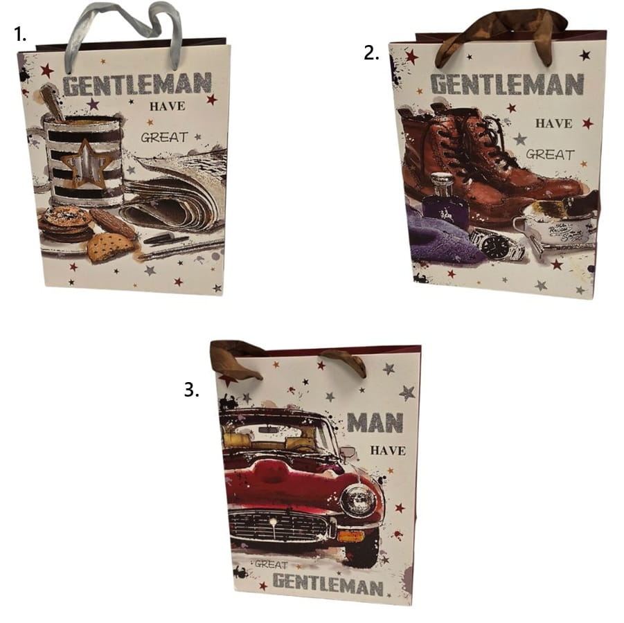 Ukrasna poklon vrećica dimenzija 18 x 23 cm savršen je izbor za elegantno pakiranje poklona. Dizajnirana s atraktivnim muškim motivima poput retro automobila, obuće i lifestyle detalja, idealna je za poklone za muškarce svih uzrasta.